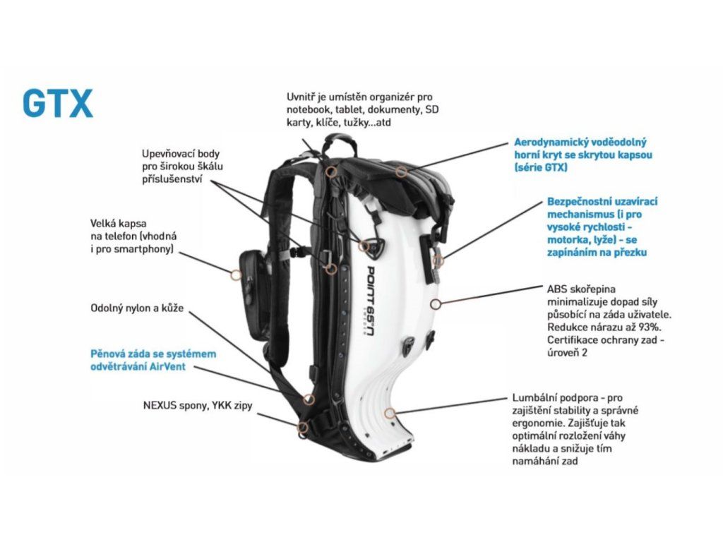 Batoh je certifikovány dle EN 1621-2 jako zcela plnohodnotná ochrana zad (pouze za předpokladu správného použítí, především utažení). "Master Class" Back Protector úroveň 2 : certifikace pro ochranu zad. Přenos síly pouze 5,8 kN [CE/TüV]. Nejlepší ochrana Vašeho vybavení. Batoh Boblbee GTX 20L je vybaven zadním panelem z pěny se sytémem AirVent, která brání přehřátí zad a zlepšuje ochranu páteře. Nový zadní panel výrazně zlepšuje redukci nárazu (až 94%). Batohy jsou univerzální a nabízí celou řadu doplňků, které umožňují přenášet opravdu rozmanitý náklad. Aerodynamické kupolovité víko napomáhá lepšímu proudění vzduchu a poskytuje mimořádnou ochranu proti promočení. Základní objem je 20 litrů, základní váha je 1900 g, konečná váha i objem závisí na dokoupeném příslušenství. PŘIHRÁDKA NA NOTEBOOK - maximální velikost notebooku - 15 palců / 33 x 23 x 5 cm. NORMA IATA PRO ZAVAZADLA - lze použít jako příruční zavazadlo. Optimalizovaný design pro snadné nošení, komfort a aerodynamiku. Vyvážené a stabilizační ergonomické vlastnosti pro aktivní uživatele.Certifikát třídy 2 pro ochranu zad - skořepina byla navržena tak, aby minimalizovala dopad síly působící na záda uživatelů. Působící síla se rozprostře do co největší plochy, a tím sníží náraz a transformaci energie na jednotku plochy.Bederní podpůrný systém (Lumbar Support System) - tvar skořepiny ve tvaru S odděluje horní úložný prostor od spodní bederní oblasti - zajišťuje tak optimální rozložení váhy nákladu a snižuje tím namáhání zad.Aerodynamický design - design kombinuje uživatelské nároky související s rychlostí. Skořepina snižuje aerodynamický odpor na těle, bez externího příslušenství a popruhů je odpor větru minimální. SKOŘEPINANA NOTEBOOKNA CESTYBÍLÁ LESK56X30X15 CM1900 G38X26X5 CM25 LDoplňkové parametry
