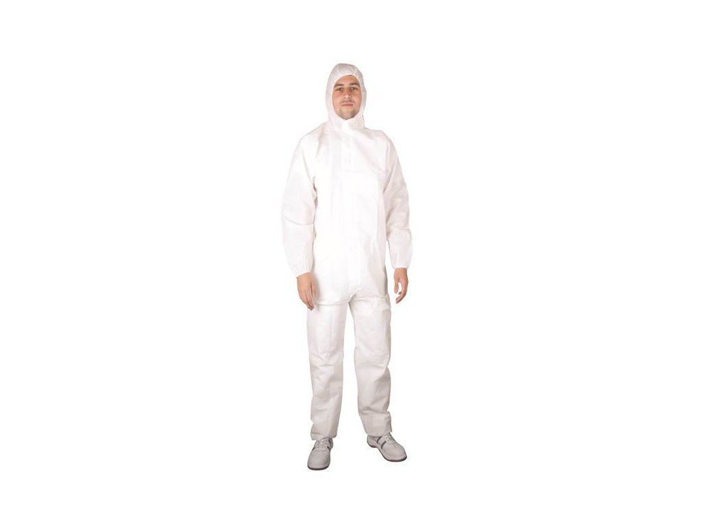- bílý jednorázový ochranný overal s elastickou kapucí